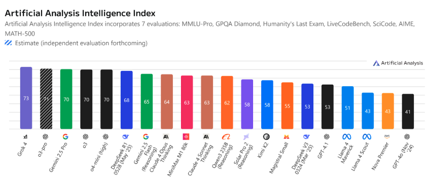 Yes, Grok 4 posted the highest intelligence index in recent testing, scoring a 73 and surpassing even OpenAI’s leading models. It also dominated rigorous benchmarks like GPQA Diamond and AIME. Gemini 2.5 Pro, meanwhile, has been lauded for its versatility. It handles text, vision, and coding tasks with consistent performance. DeepSeek R1 comes close in reasoning scores while offering one of the lowest cost-per-token rates available.